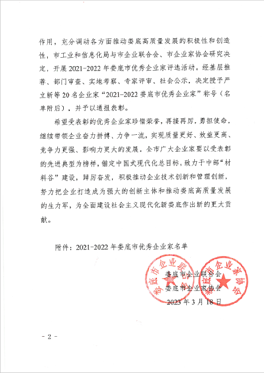 關(guān)于表彰2021-2022年婁底市優(yōu)秀企業(yè)家的決定