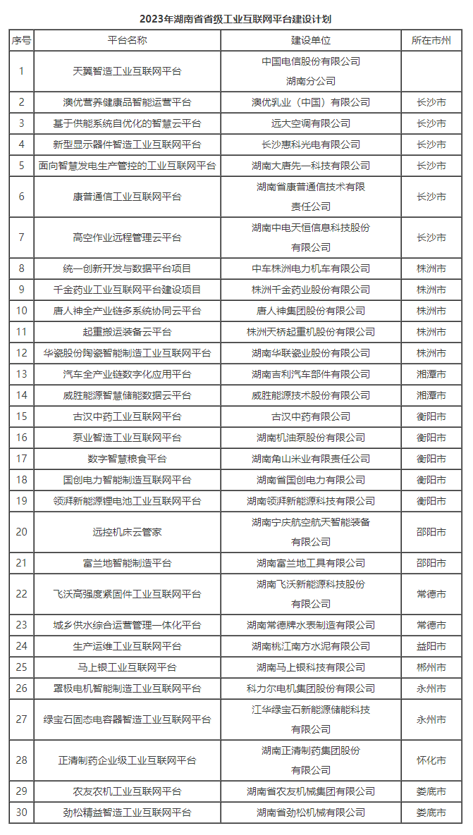 為深入開展“智賦萬企”行動持續(xù)建設省級工業(yè)互聯(lián)網(wǎng)平臺體系,加快企業(yè)數(shù)字化轉型打造國家重要先進制造業(yè)高地,經(jīng)企業(yè)申報、市州推薦、現(xiàn)場答辯、專家評審等程序,省工信廳同意天翼智造工業(yè)互聯(lián)網(wǎng)平臺等30個項目列入2023年湖南省省級工業(yè)互聯(lián)網(wǎng)平臺建設計劃,現(xiàn)予發(fā)布。