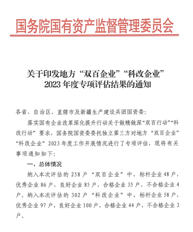 據(jù)了解,“科改企業(yè)”專項(xiàng)評估每年進(jìn)行一次,旨在落實(shí)國有企業(yè)改革深化提升行動(dòng)關(guān)于做精做深“科改行動(dòng)”要求。本次國務(wù)院國資委委托獨(dú)立第三方對地方“科改企業(yè)”2023年度工作開展情況進(jìn)行了專項(xiàng)評估,考核結(jié)果按照得分高低分為標(biāo)桿、優(yōu)秀、良好、合格、不合格五個(gè)等級,考核內(nèi)容涉及企業(yè)科技創(chuàng)新、體制機(jī)制、綜合成效等方面共計(jì)47項(xiàng)指標(biāo),全面權(quán)威地反應(yīng)了企業(yè)在加快科技新成果轉(zhuǎn)化、提升自主創(chuàng)新能力等方面的舉措和成果。