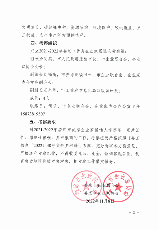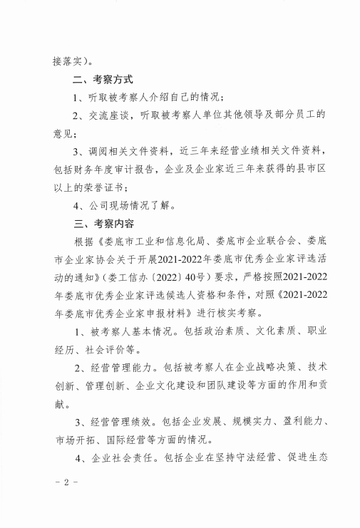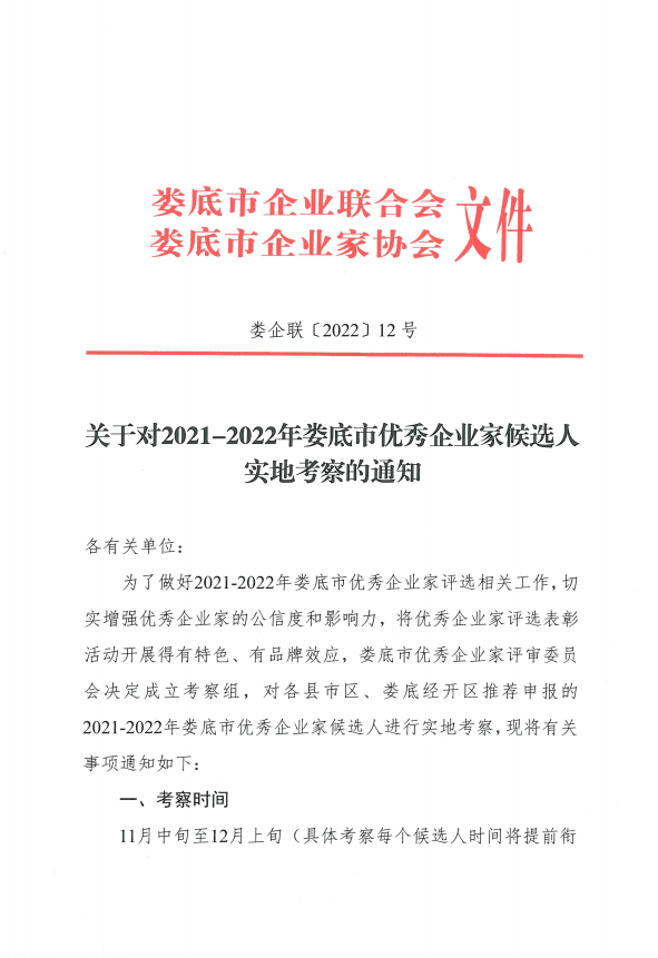 關(guān)于對(duì)2021-2022年婁底市優(yōu)秀企業(yè)家候選人實(shí)地考察的通知