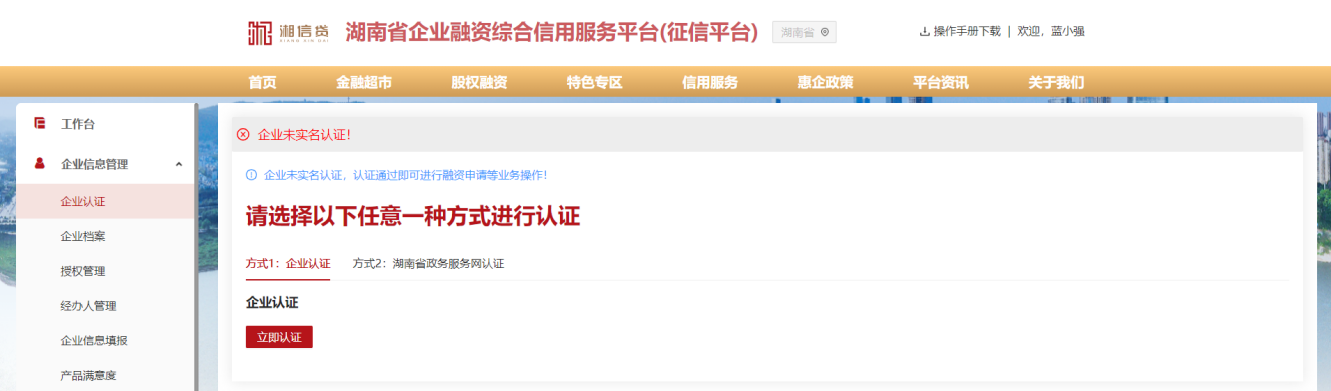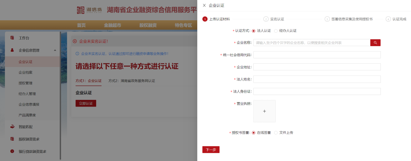 4、在企業(yè)實名認證頁面,選擇認證方式(企業(yè)認證:需上傳營業(yè)執(zhí)照信息,湖南省政務服務網(wǎng)認證:需在湖南省政務服務網(wǎng)開通了賬號),并按照認證流程進行操作。