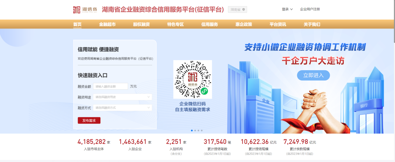 1、電腦瀏覽器輸入“湘信貸”平臺地址,訪問網(wǎng)站首頁,https://credit.fgw.hunan.gov.cn/xyd。