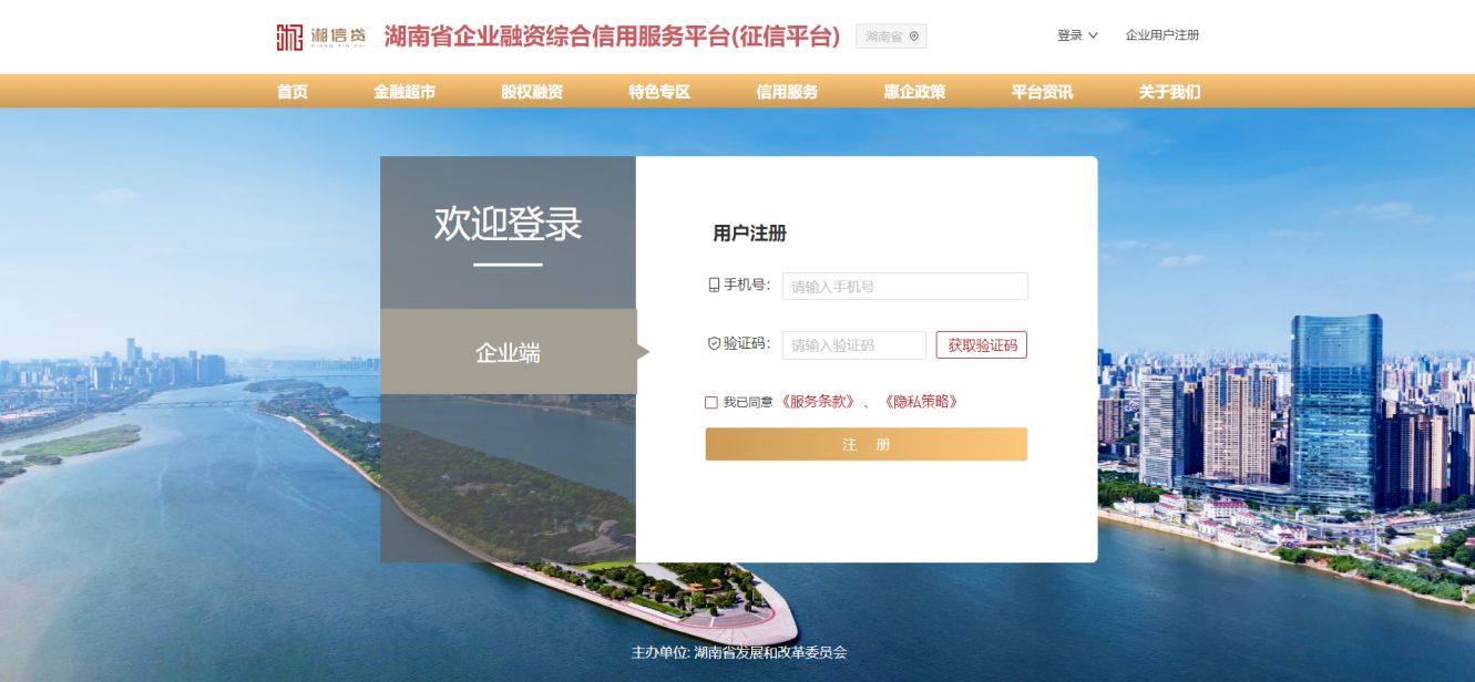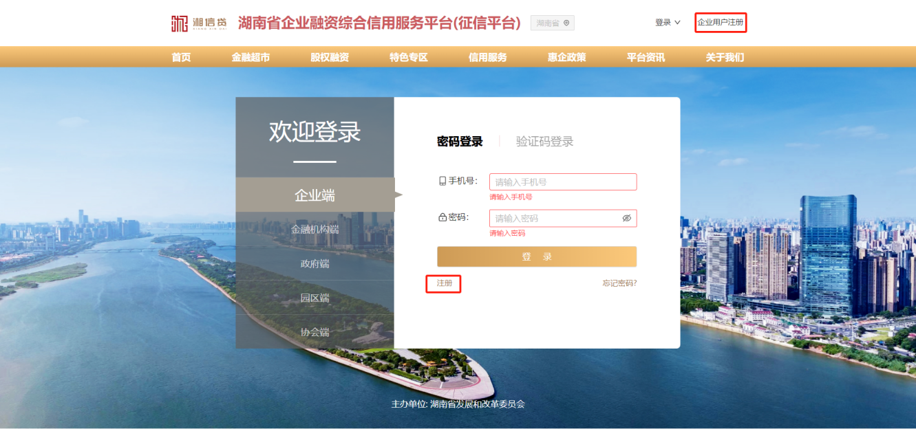 1、在“登錄頁面”左下角點擊“注冊”按鈕或在“湘信貸”平臺網(wǎng)站右上角,點擊“企業(yè)用戶注冊”按鈕,進入注冊頁面。