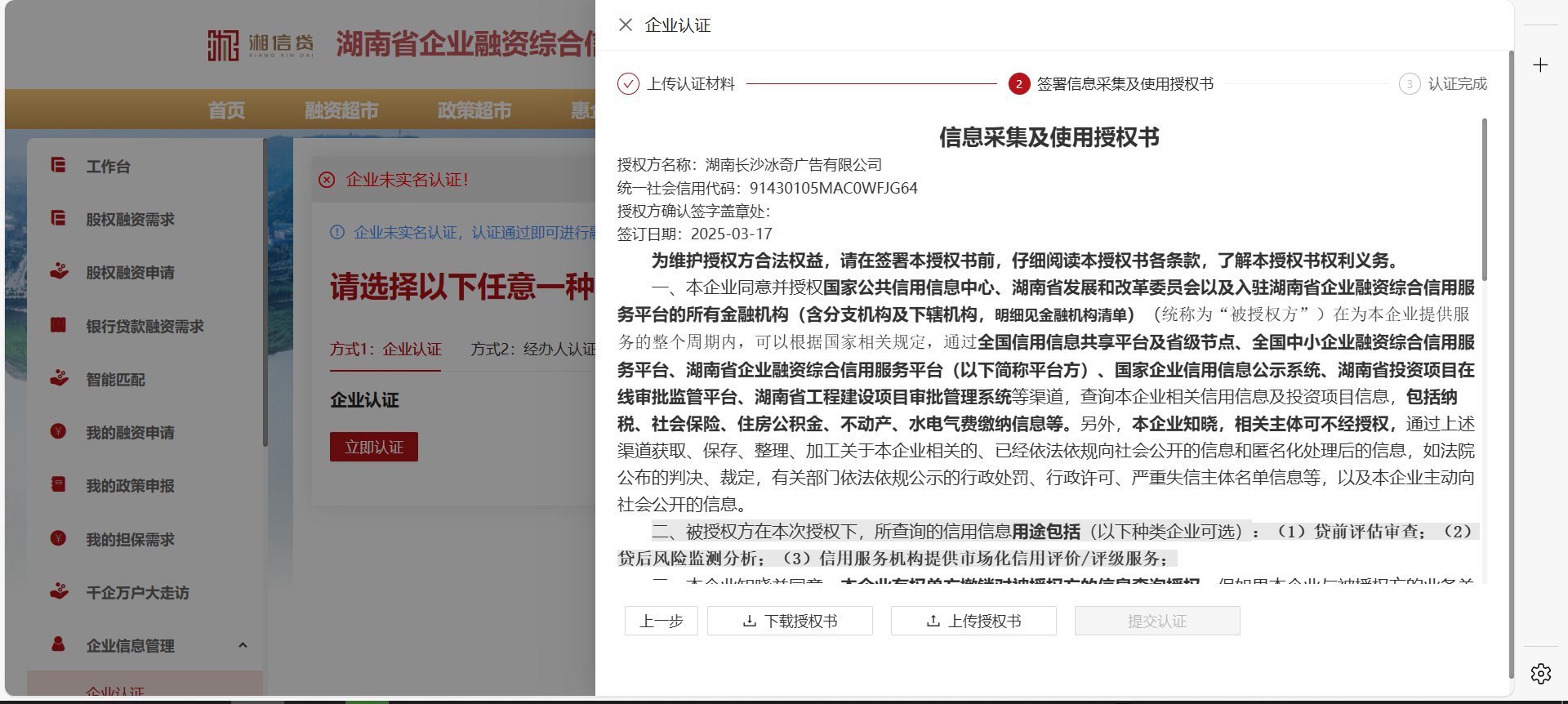 5、在完成企業(yè)認證后,進行企業(yè)信息采集使用授權書簽署上傳,允許平臺查詢企業(yè)相關基礎信息、納稅欠稅、不動產(chǎn)、水電氣繳費信息情況。