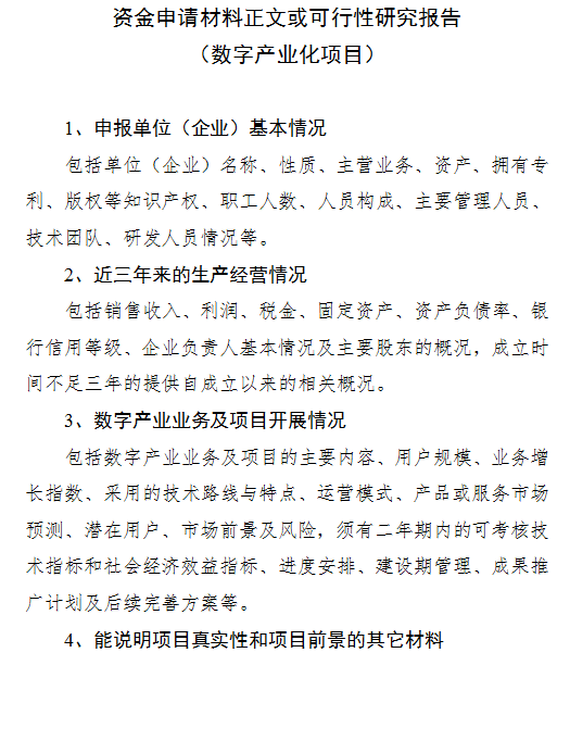 (1)數字產業(yè)化項目。申報主體為服務業(yè)企業(yè)的,要求2022年營業(yè)收入應在1000萬元以上、且當年稅收在10萬元以上,優(yōu)先支持規(guī)模以上企業(yè);申報主體為制造業(yè)企業(yè)的,應為規(guī)模以上工業(yè)企業(yè)、且2022年稅收在100萬元以上企業(yè),優(yōu)先支持具有兩化融合管理體系貫標認證資質的企業(yè)。