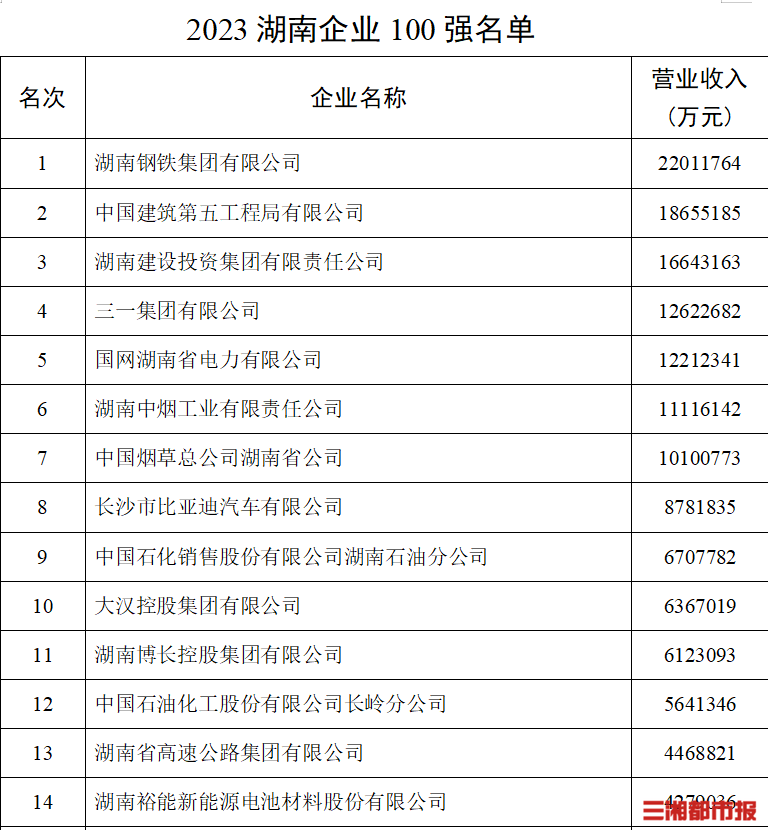 2023湖南制造業(yè)企業(yè)100強(qiáng)名單中,湖南鋼鐵集團(tuán)有限公司、三一集團(tuán)有限公司、湖南中煙工業(yè)有限責(zé)任公司居前三名,后兩家公司的營(yíng)收分別為1262億元和1112億元。在2023湖南服務(wù)業(yè)企業(yè)50強(qiáng)名單中,國(guó)網(wǎng)湖南省電力有限公司、中國(guó)煙草總公司湖南省公司、中國(guó)石化銷售股份有限公司湖南石油分公司分別以1221億元、1010億元、670億元的營(yíng)收排名前三。